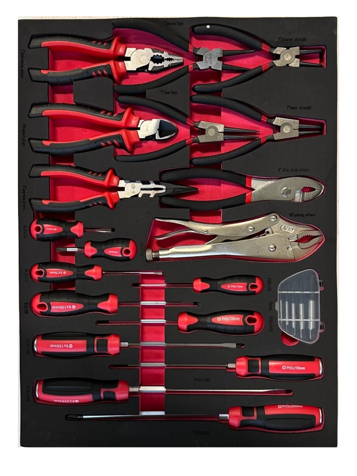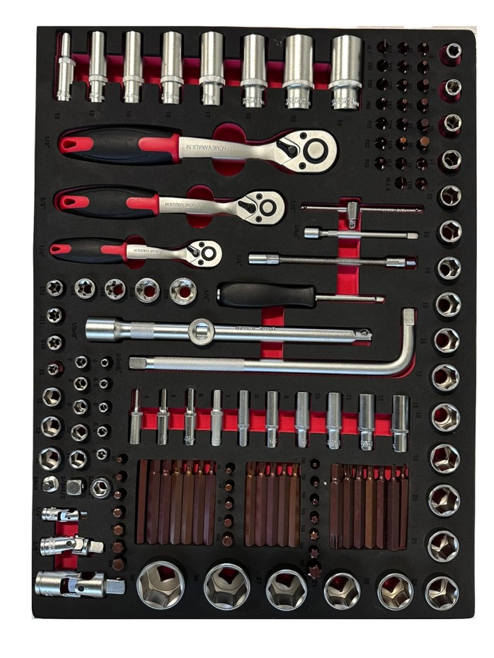 Kvaliteetne tööriistakomplekt padrunite, võtmete, kruvikeerajate ja tangidega Mitmekülgne ja professionaalne tööriistakomplekt, mis sisaldab kõike vajalikku mootorsõidukite hoolduseks, remondiks ja üldiseks tööks. Kõik tööriistad on valmistatud vastupidavast Cr-V terasest ning organiseeritud praktiliseks ja mugavaks kasutamiseks.