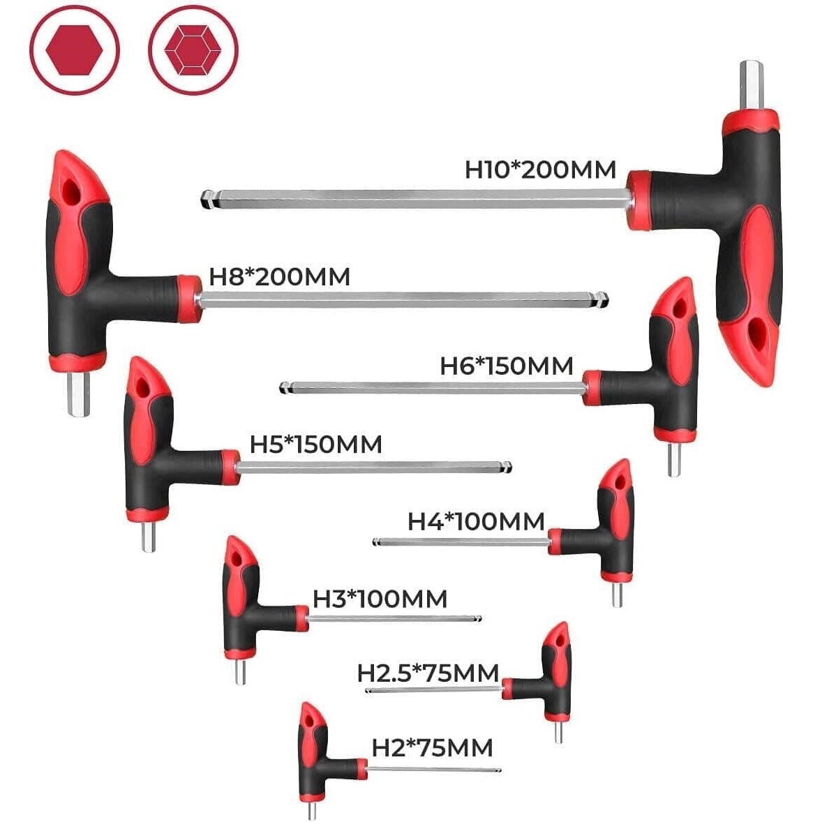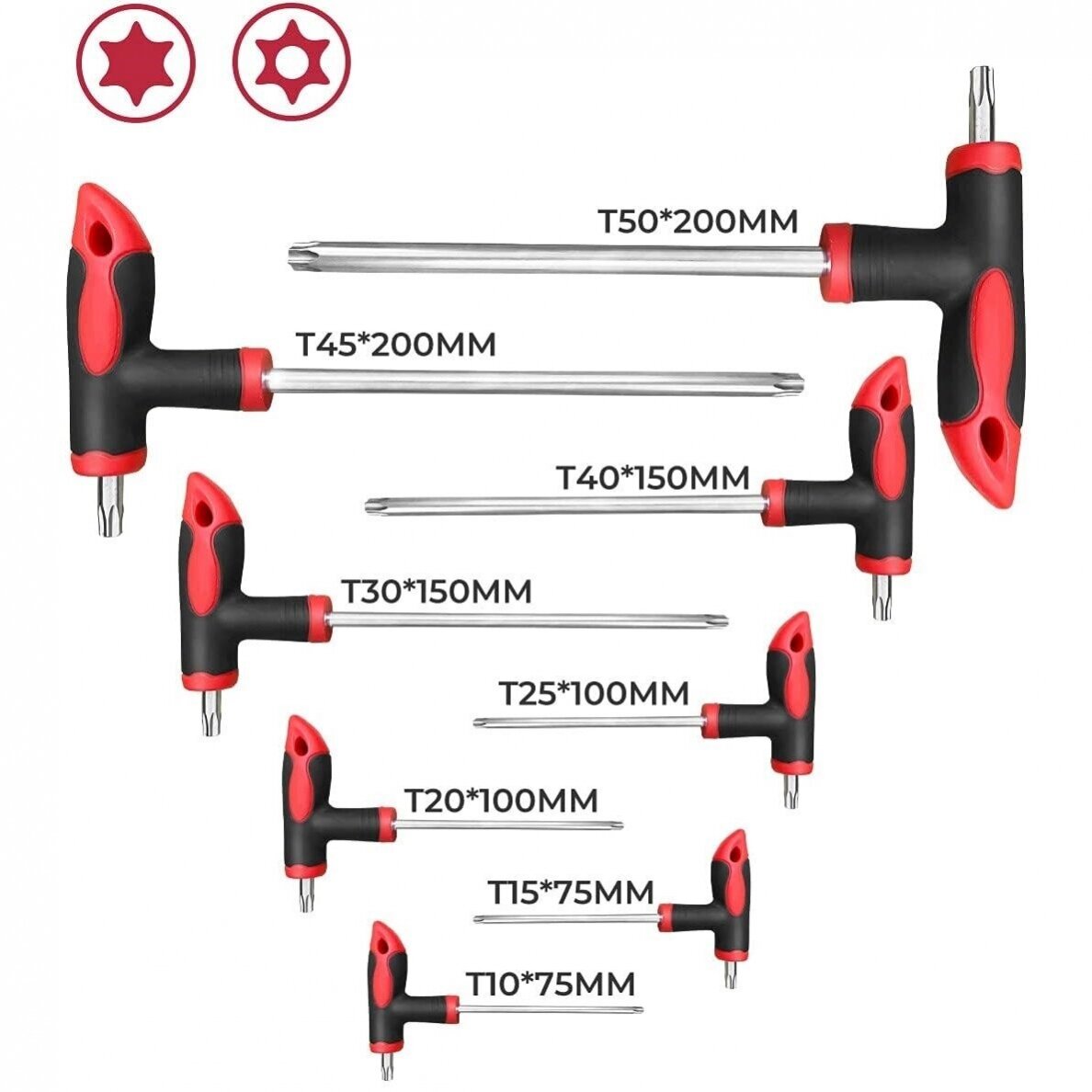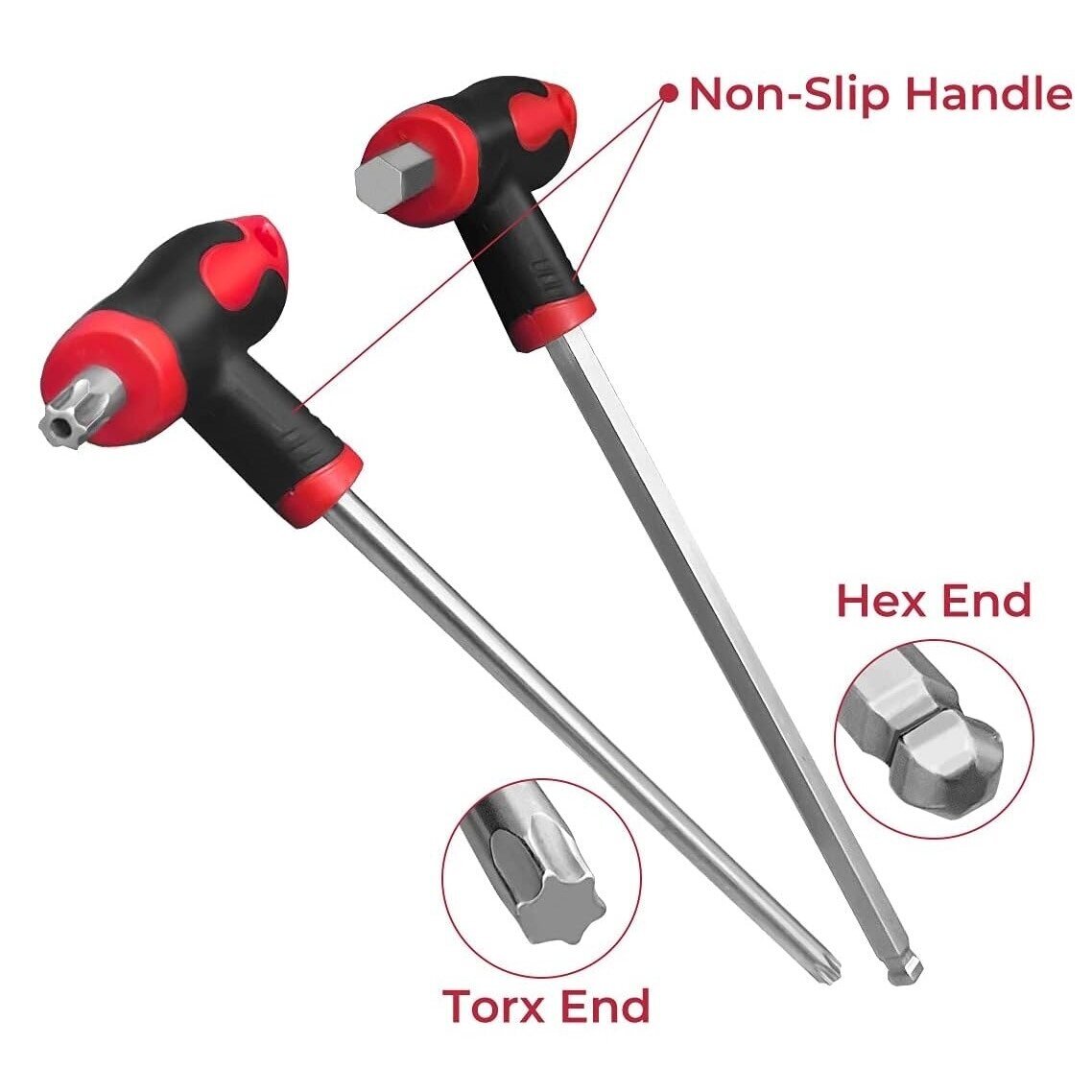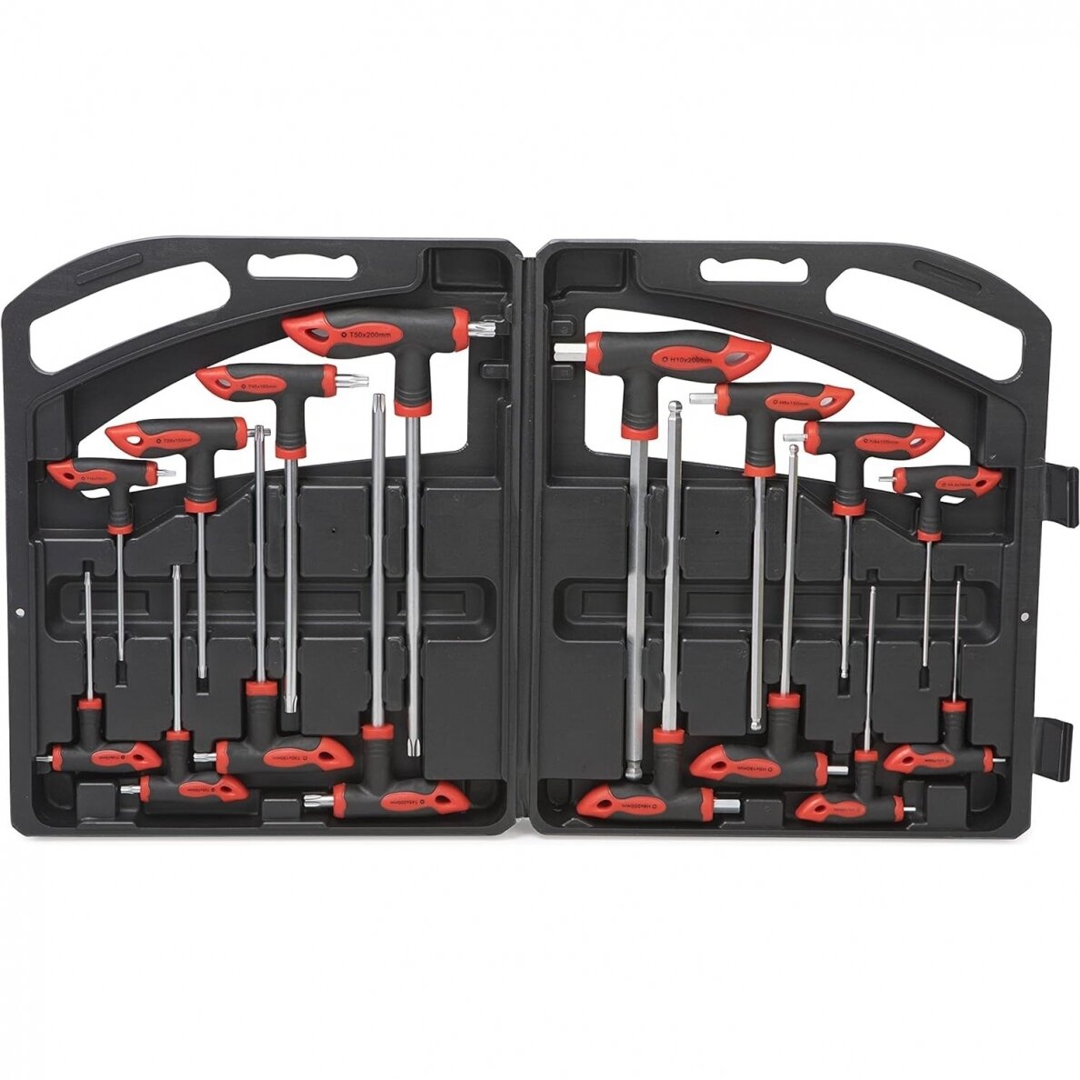 Komplekt sisaldab: HEX: H2x75, H2,5x75, H3x100, H4x100, H5x150, H6x150, H8x200, H10x200 mm TORX: T10x75, T15x75, T20x100, T25x100, T30x150, T40x150, T45x200, T50x200 mm