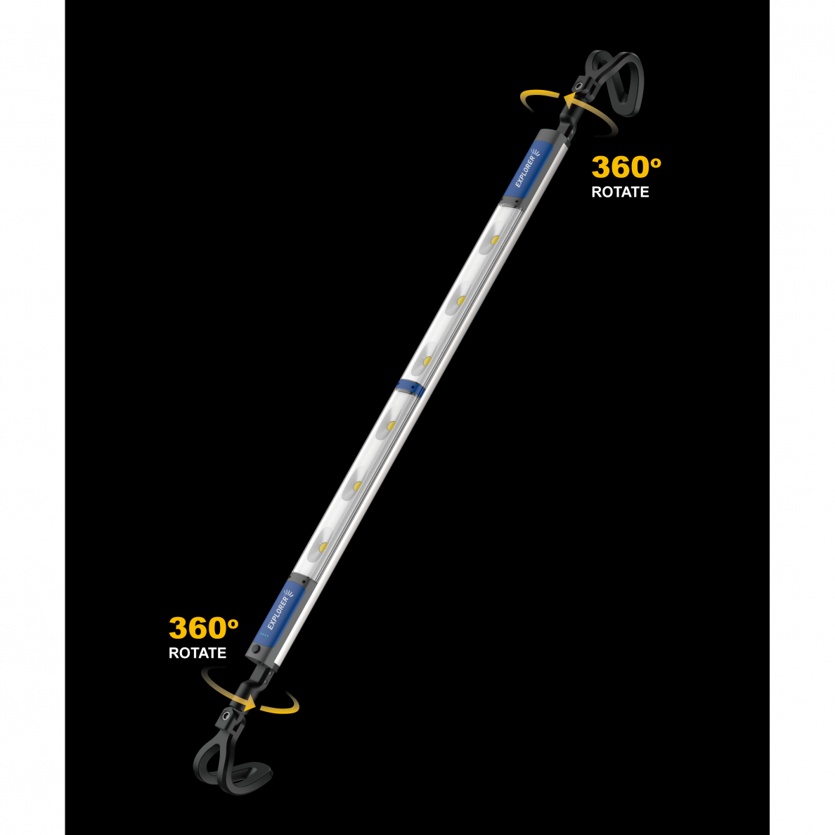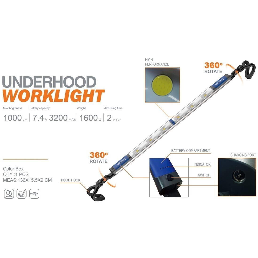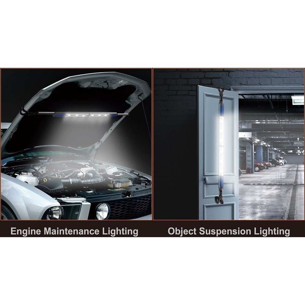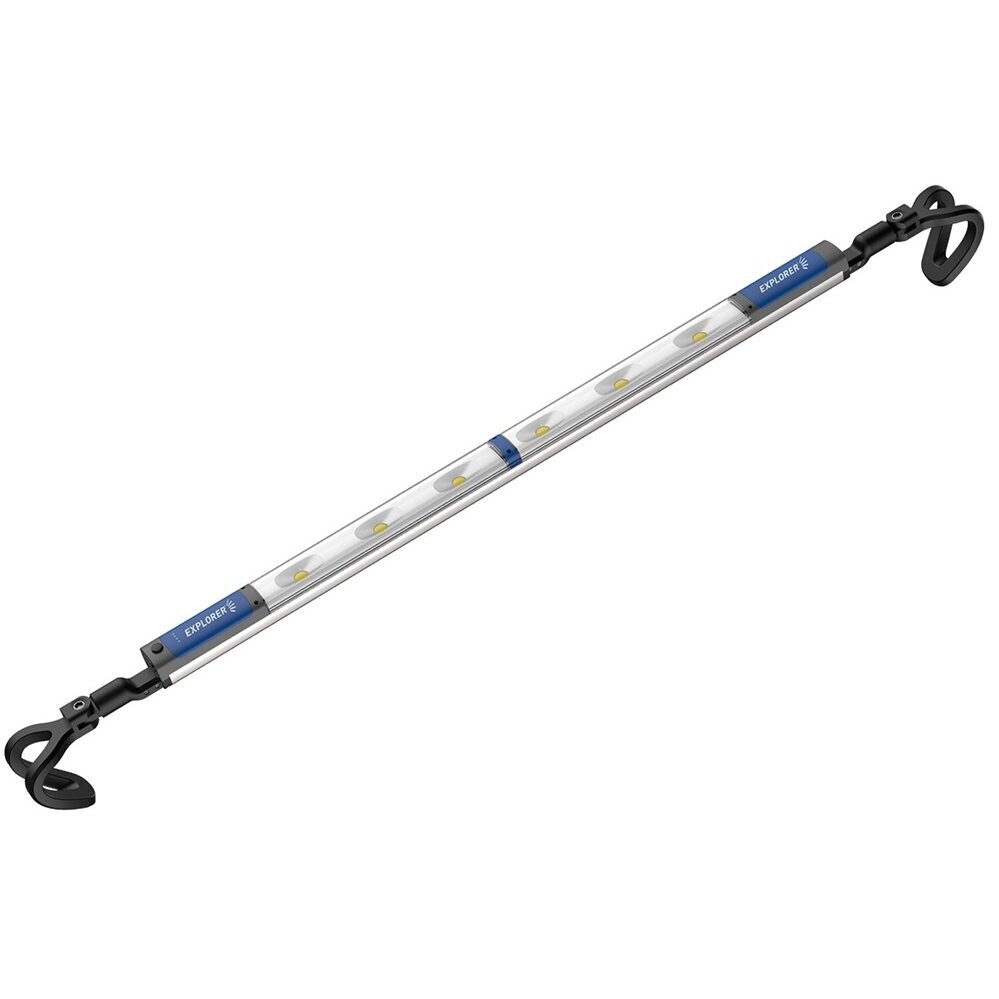 1200 lm laetav prožektor: COB x 6 tk Aku: 2 x 18650, 7.4V / 3200 MAh Funktsioon: 30 – 100% Maksimaalne võimsus: 1000 lm Tööaeg: 1,5 – 4,5 tundi Laadimisaeg: 3 tundi 12V 2.5A adapteriga Prožektor töötab laadimise ajal. Toote mõõtmed: 1300 x 80 x 130 mm (pikendatav kuni 1900 mm)