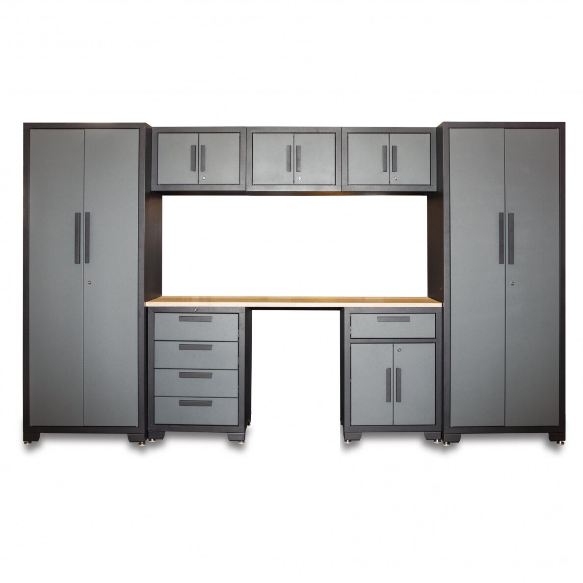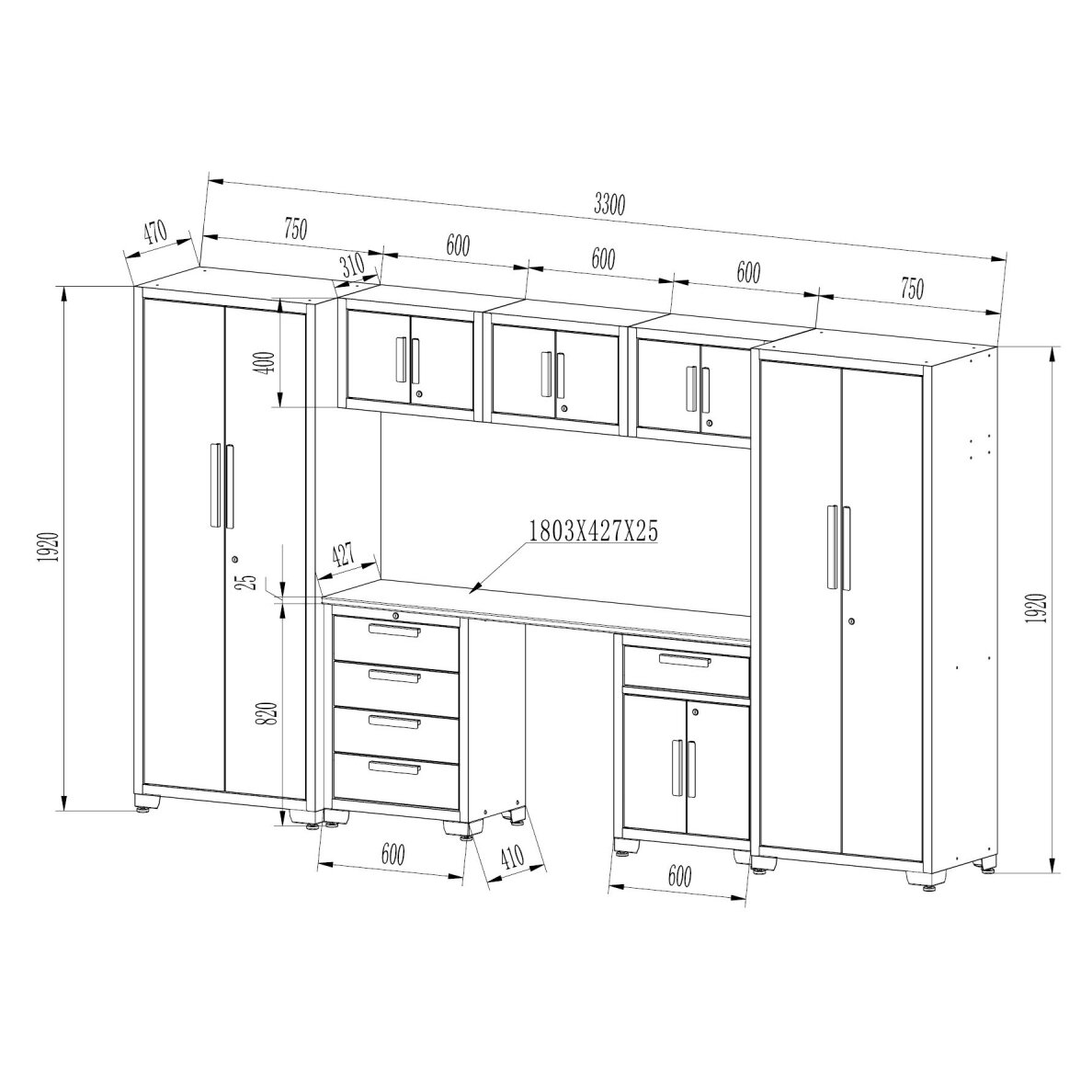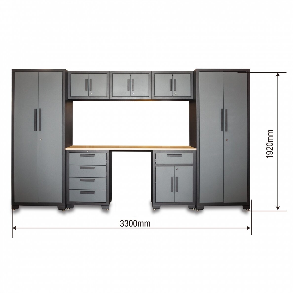 Garaažikapi komplekt - tööriistakapi komplekt (3300 x 1920 x 470 mm) See tööriistakapi komplekt on mitmekülgne ja mahukas hoiulahendus, mis aitab teil oma tööriistu ja seadmeid korrastatuna hoida. Tugev konstruktsioon ja läbimõeldud disain muudavad selle komplekti ideaalseks garaažidesse, töökodadesse ja professionaalsetesse töökohtadesse. Komplekt sisaldab: 2 x kaheukselist kappi - mõlemal on kolm reguleeritava kõrgusega riiulit, mis võimaldavad teil mugavalt hoiustada erinevaid tööriistu ja tarvikuid. 1 x 4 sahtliga käru - mobiilne hoiuseade nelja avara sahtliga, mis sobib ideaalselt väiksemate tööriistade ja tarvikute korraldamiseks. 1 x kaheukseline kapp ühe sahtliga - pakub nii riiuli- kui ka sahtlihoiust, pakkudes mugavat kohta mitmesuguste tööriistade ja tarvikute hoidmiseks. 1 x vineerist töölaud (1800 mm pikk) - vastupidav ja avar tööpind, mis sobib ideaalselt monteerimiseks, remondiks ja muudeks töödeks. 3 x seinakappi ustega - ülalt avanevad ruumi kokkuhoiuks, võimaldades teil hoida oma kõige sagedamini kasutatavaid esemeid käeulatuses ja tööala korras. Kogulaiusega 3300 mm on see vastupidav tööriistakapi komplekt ideaalne lahendus funktsionaalseks ja tõhusaks tööruumi korraldamiseks. Värvus RAL7043.